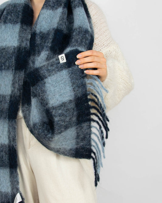 Granatowo niebieski (moher + alpaka + wełna) szal w kratę BECKSÖNDERGAARD