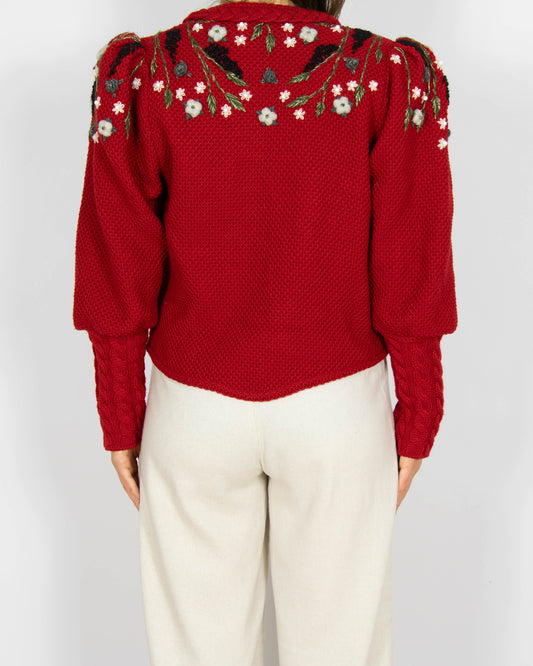 Czerwony wełniany kardigan z haftowanymi kwiatami Lanamoden Salzburg - S/M