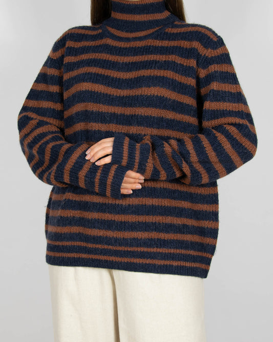 Brązowo granatowy (wełna + alpaka) sweter w paski Second Female - XL