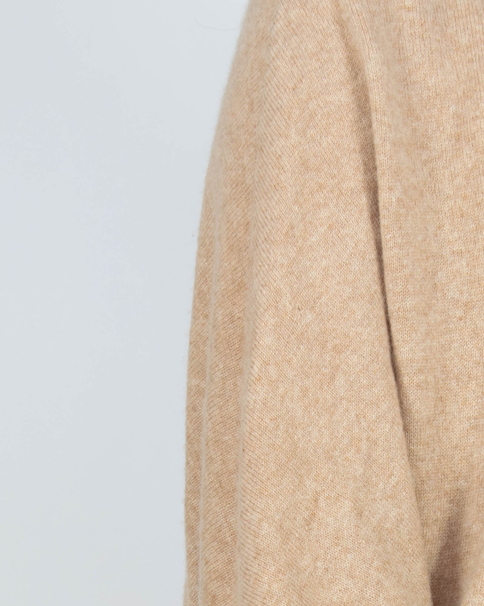 Beżowy kaszmirowy długi kardigan marki premium (THE MERCER) N.Y. Kardigan jest bardzo miękki i przyjemny w dotyku. Ceny detaliczne kaszmirowych swetrów tej marki wynoszą 1700-1900 zł.