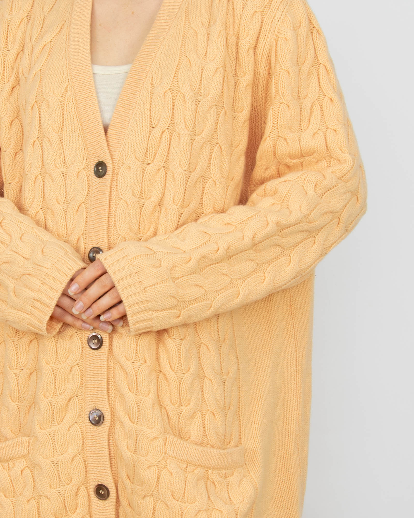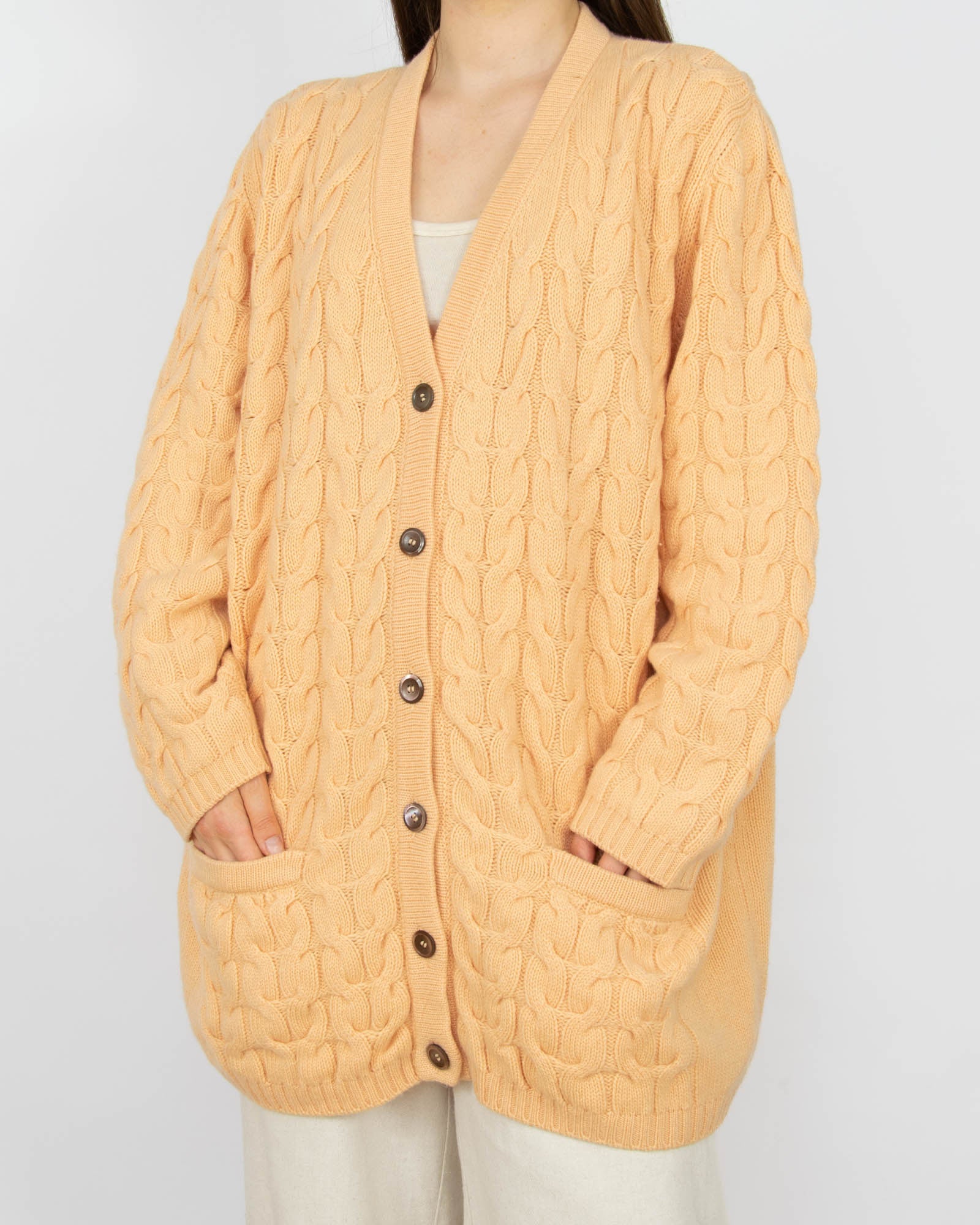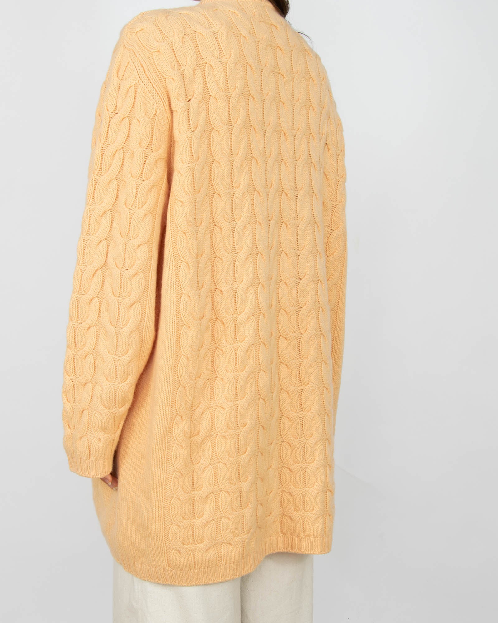 Brzoskwiniowy gruby kaszmirowy kardigan włoskiej marki LUCIANA GREGORAT. Kardigan wykonany we Włoszech, ze wspaniałej jakości kaszmiru.