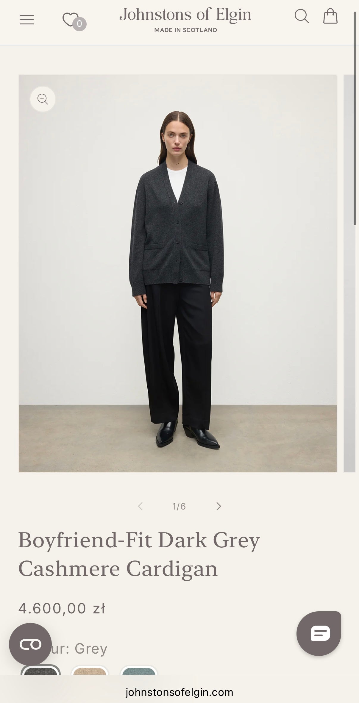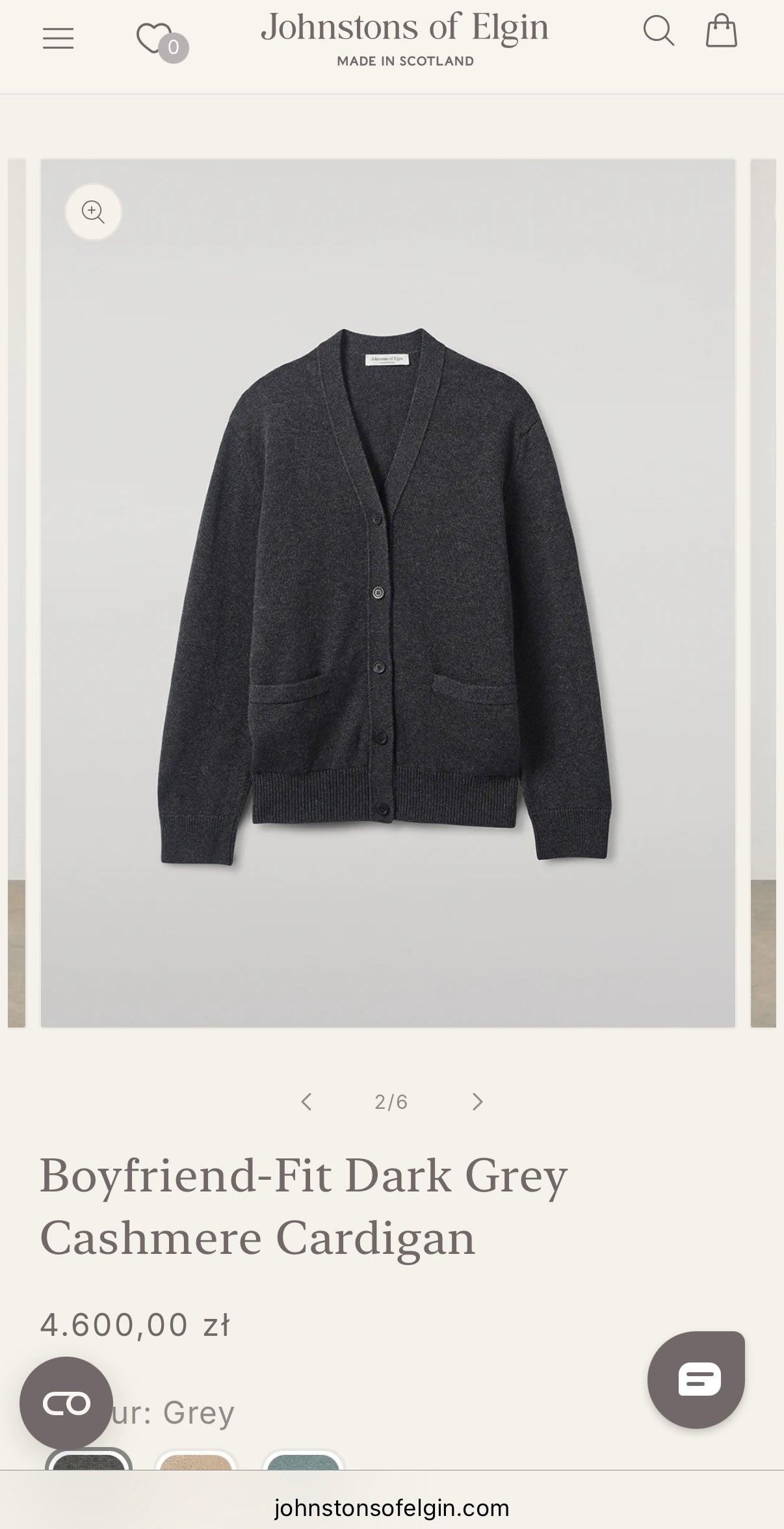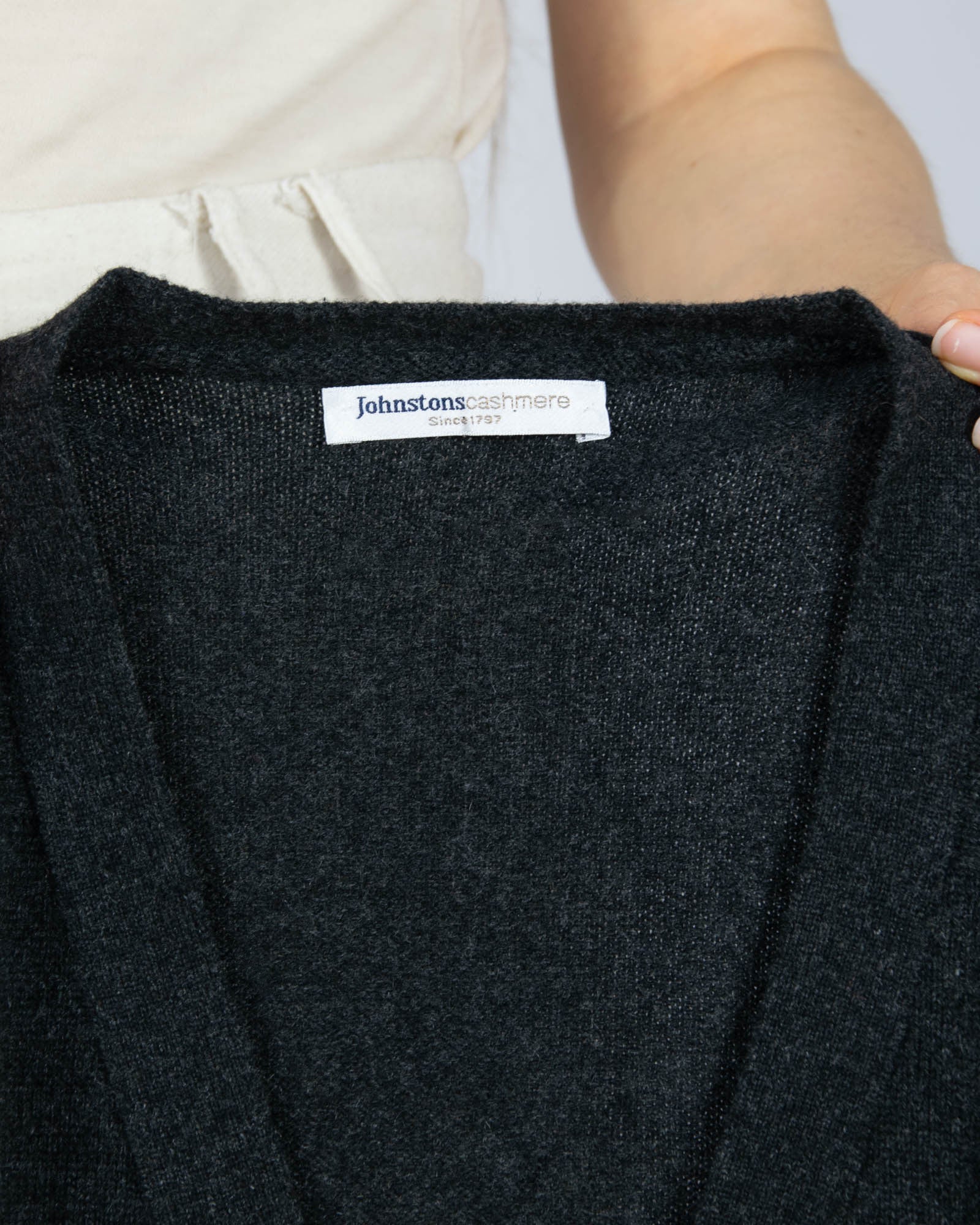 Ciemnoszary kaszmirowy kardigan luksusowej marki JOHNSTONS OF ELGIN. Cena tego kardiganu na stronie marki to 4600 zł.