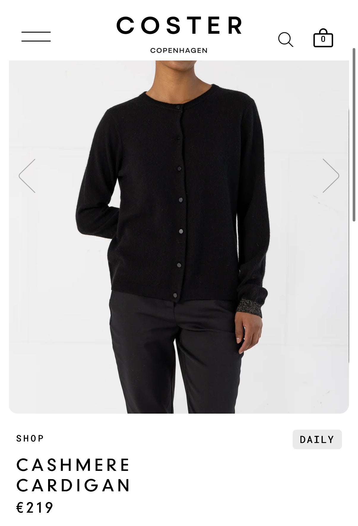 Czarny kaszmirowy kardigan marki Coster Copenhagen z linii CC Heart. Cena tego kardiganu na stronie marki to 219€ (~930 zł).