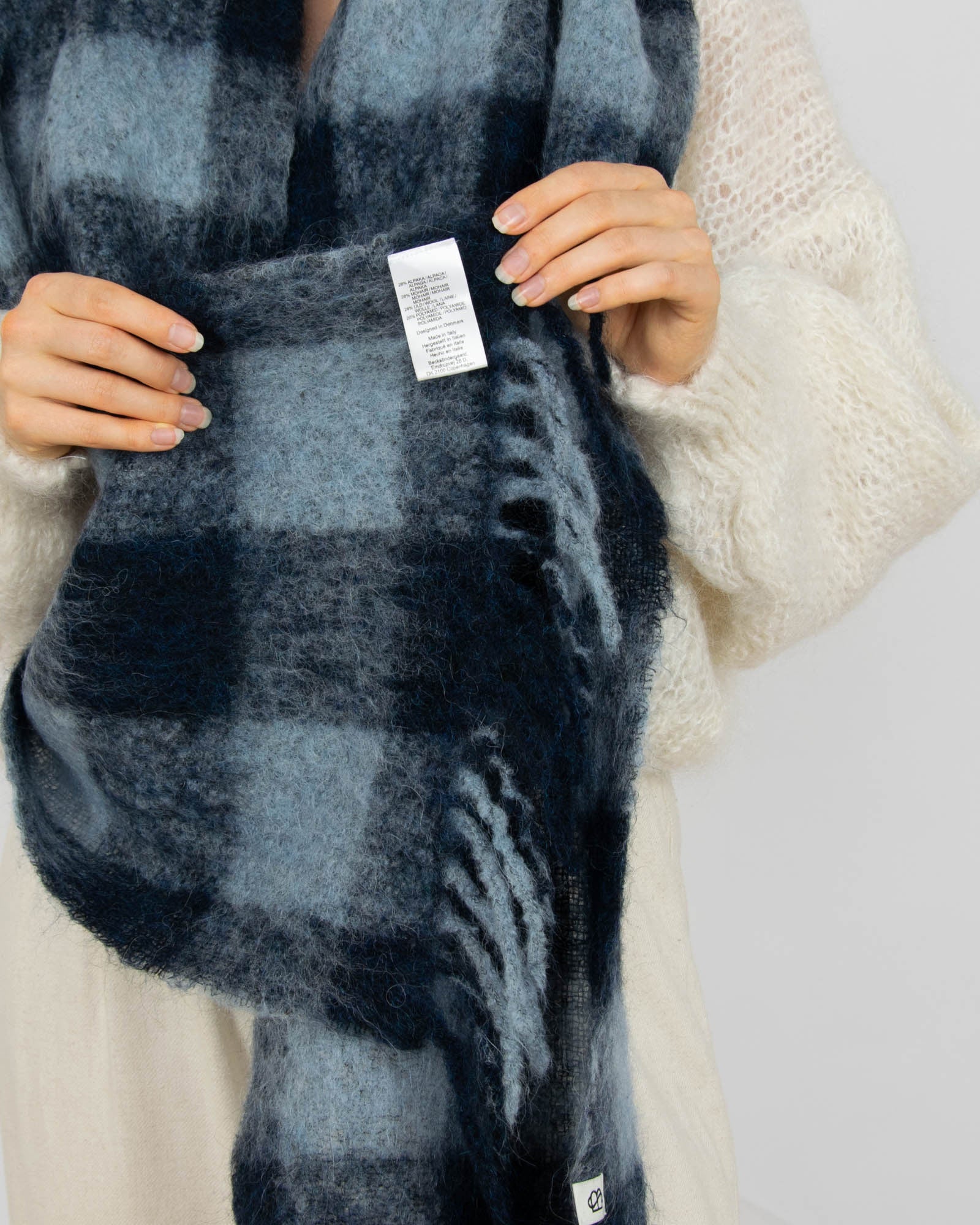 Granatowo niebieski (moher + alpaka + wełna) szal w kratę duńskiej marki BECKSÖNDERGAARD. Szalik wykonany we Włoszech. Cena podobnych szalików z taką samą procentową zawartością wełny to 569 zł.
