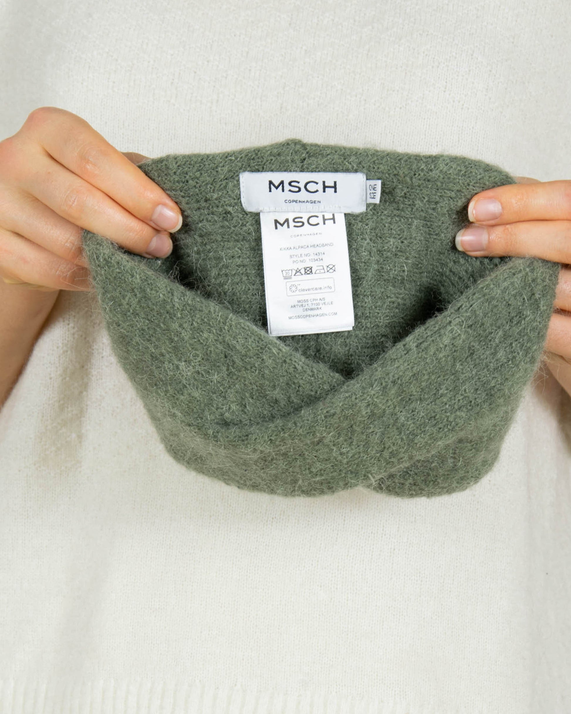 Oliwkowa (alpaka + wełna) opaska na głowę skandynawskiej marki MSCH Copenhagen.