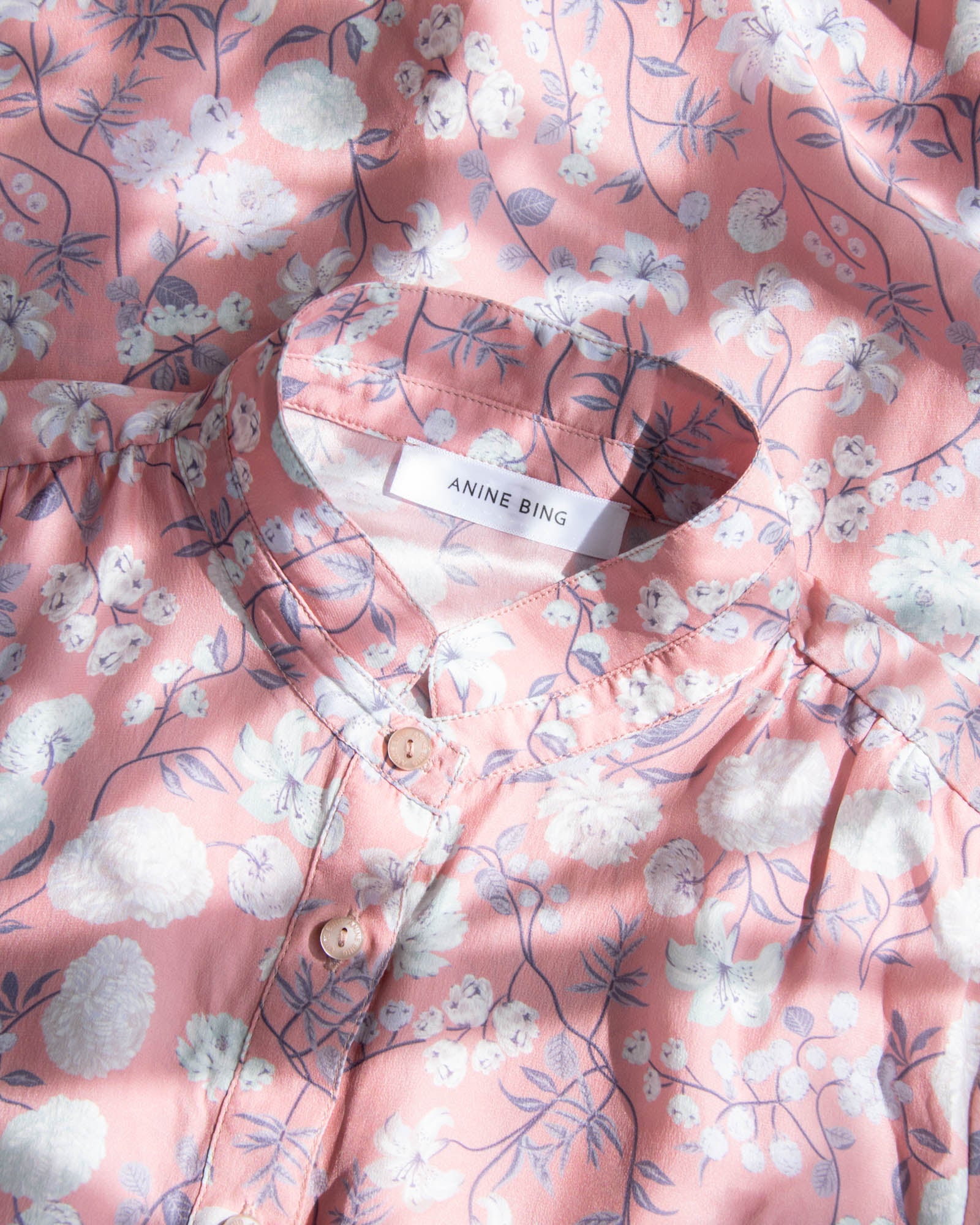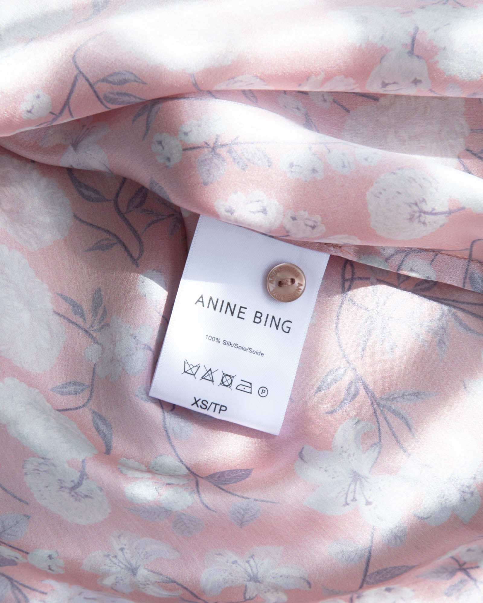 Różowa jedwabna sukienka w kwiaty designerskiej marki ANINE BING. Ceny jedwabnych sukienek tej długości tej marki to koszt ok 2000 zł.