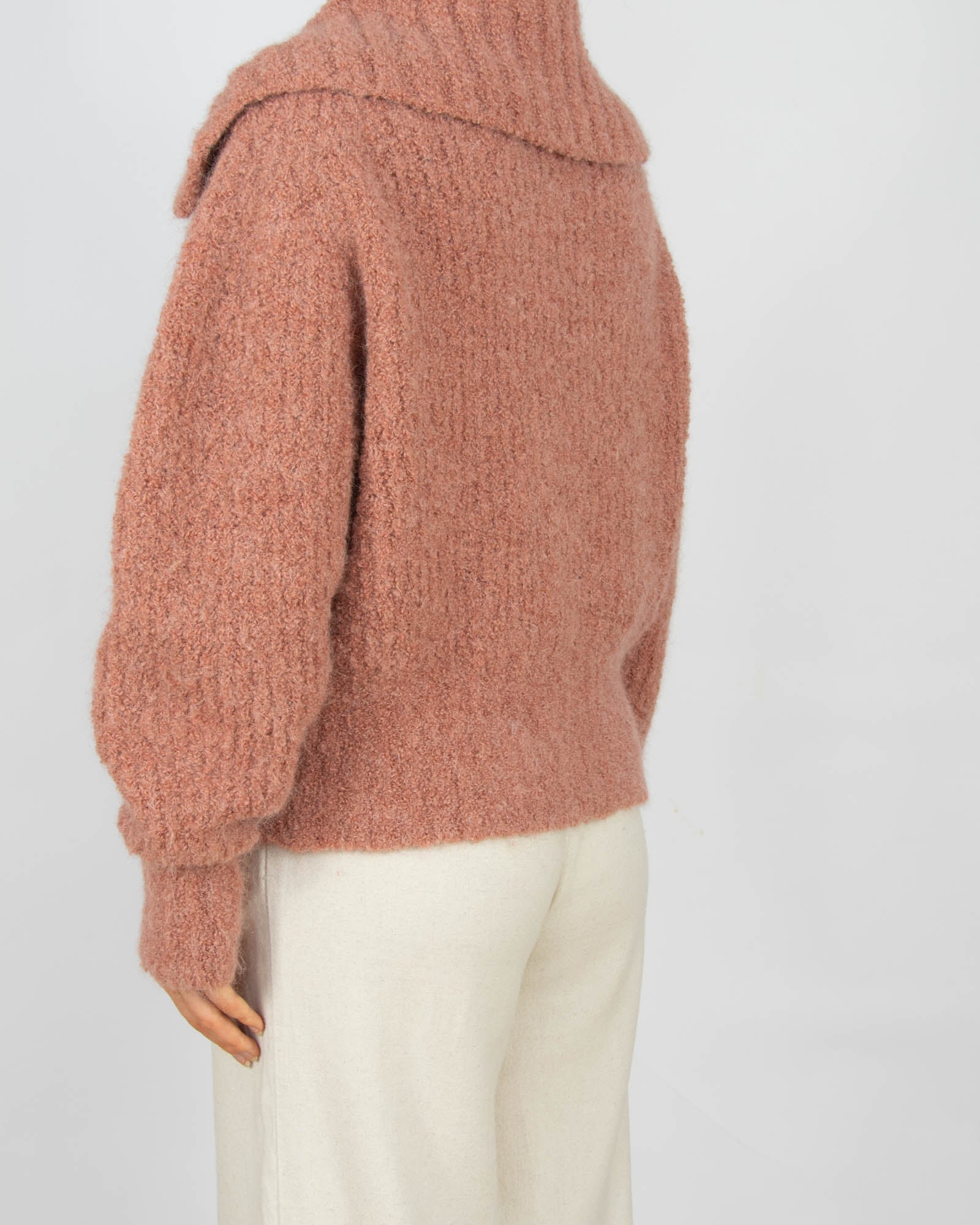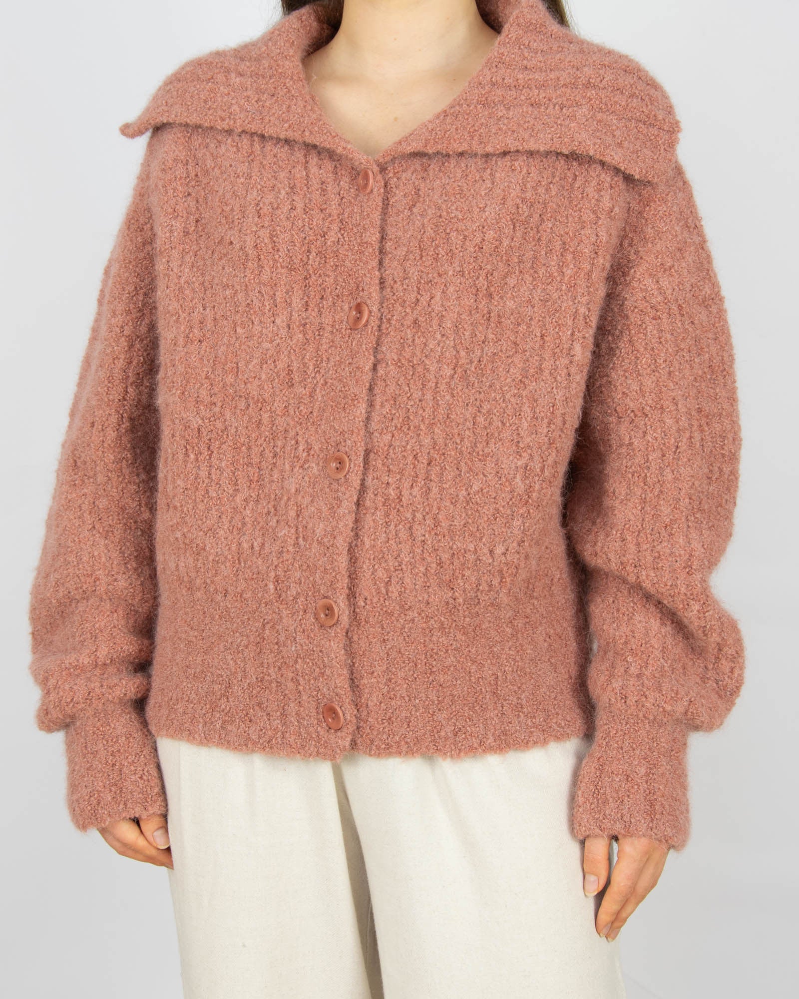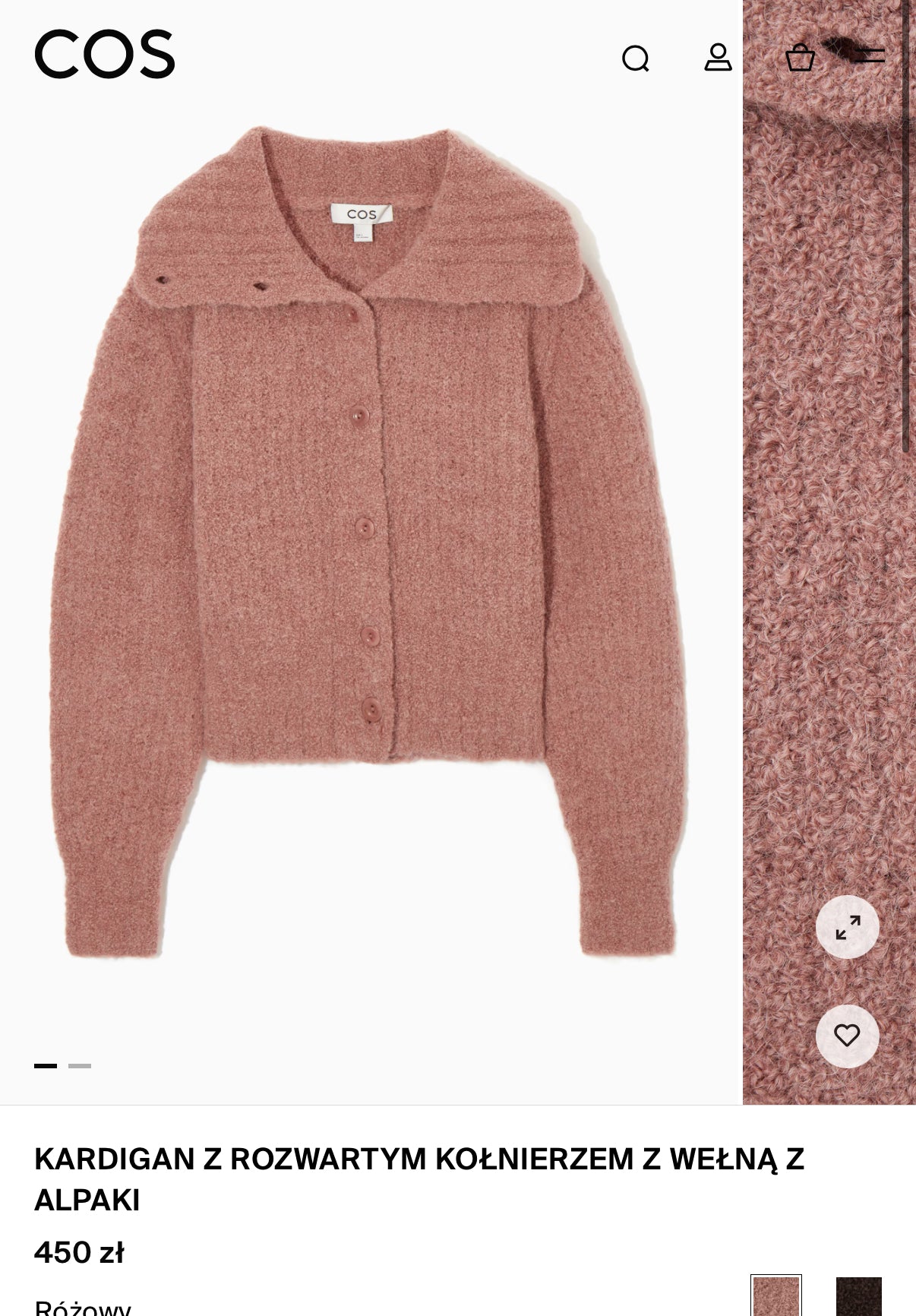 Różowy wełniany (alpaka) kardigan marki COS. Cena tego kardiganu na stronie marki wynosi 450 zł. Aktualnie wyprzedany.