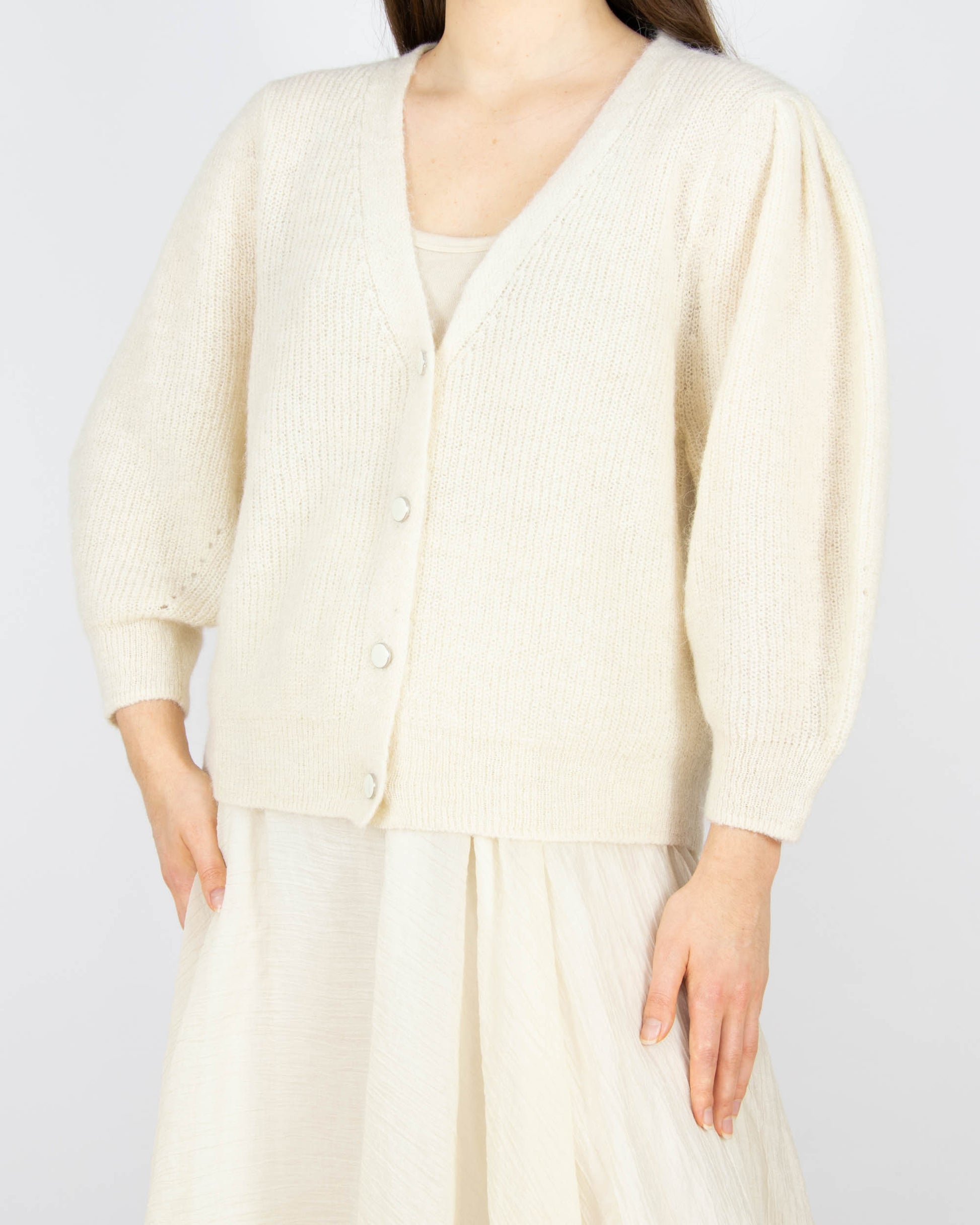 Śmietankowy (alpaka + wełna) kardigan duńskiej marki SOAKED in Luxury.